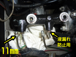 シリンダヘッド後端からヒーターバルブに向かうホースの点検