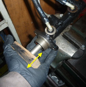 プライマリピストンを木の丸棒で奥まで押し込みつつつ、スプリングの力で飛び出てこないように ストップボルトを入れて止める。